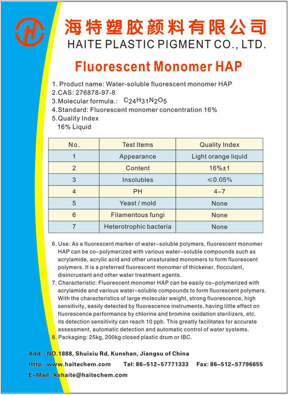 HAPNQ ist braune Flüssigkeit mit 16% Konzentration und 84% Wasser. Wenn sie in den Brauchwassersystemen verwendet werden, können Leuchtstoffsignale von diesem etikettierte Polymere benutzt werden, um zu bestimmen, wieviele etikettierten Polymere in den Brauchwassersystemen anwesend sind.
